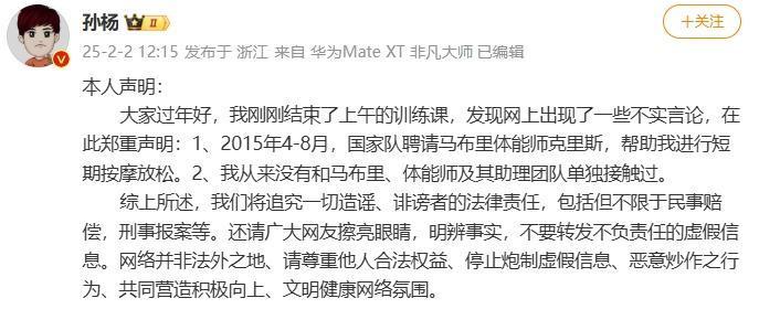 据央广网消息,2月2日,孙杨发表声明,对近日的相关传言进行了辟谣,将对不实消息追究法律责任。